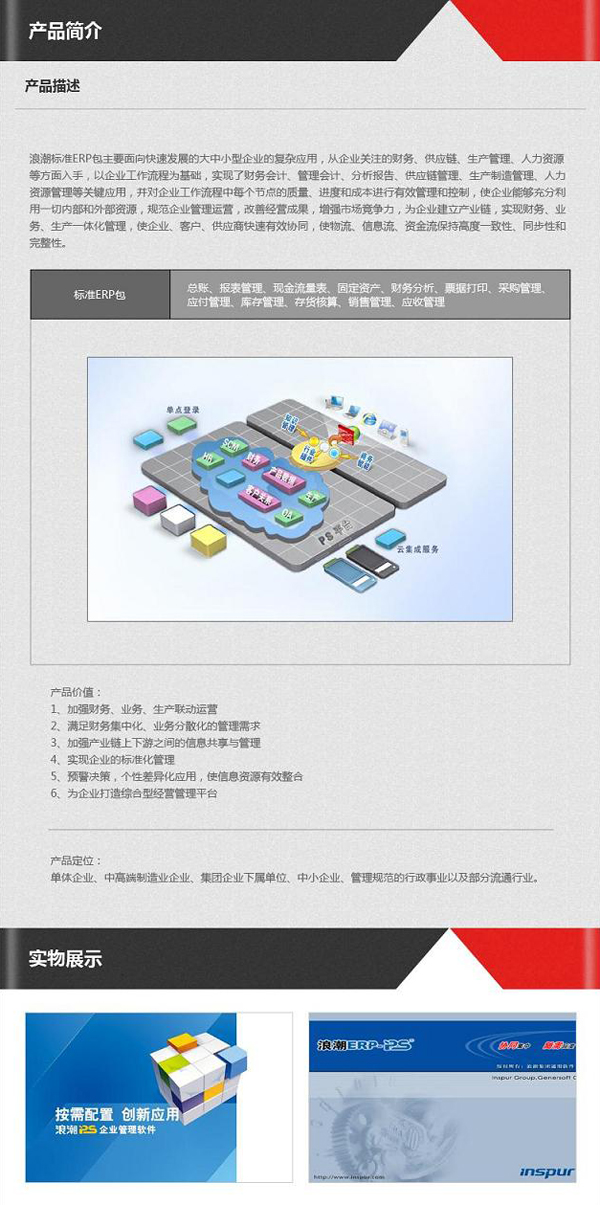 浪潮ERP-PS主要从企业比较关心的财务、物流、生产管理、人力资源等入手,以企业工作流程为基础,对企业工作流程中每个节点的质量、进度和成本进行有效的管理和控制,使企业能够充分利用一切内部、外部资源,来提高企业的销售收入和利润,增强企业的国际竞争力。